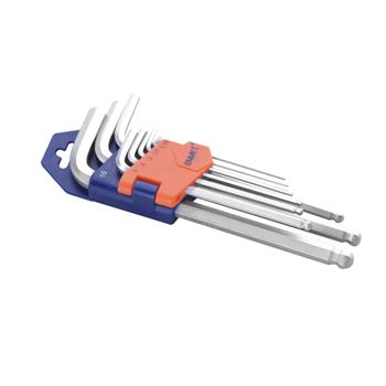 產品名稱:9件套公制加長球頭內六角扳手品牌:EMMET◎CR-V鋼制造,整體淬火,尾端倒角方便插入螺帽。◎球形頭方便在各種狹小空間角度使用。◎1.5,2,2.5,3,4,5,6,8,10mm。